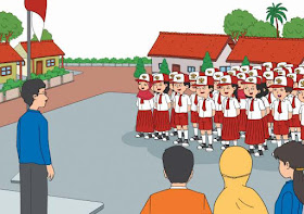 Saat bel berbunyi Udin dan teman-teman berkumpul di lapangan